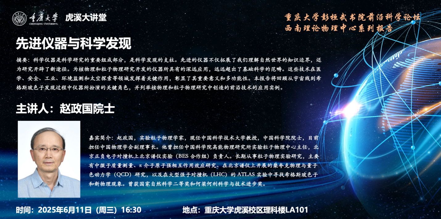 2025年6月11日16:30,中国科学技术大学教授赵政国院士莅临中文无码 ,做客中文无码 “虎溪大讲堂”,为我们带来了一场题为“先进仪器与科学发现”的精彩学术报告。中文无码 院长吴兴刚教授主持了本次报告会。