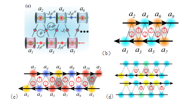 研究表明,交错磁通的调控可模拟超导体中类似的迈斯纳相-涡旋相的相变。在新超辐射相变中,通过调节交错磁通量,观测到在奇数或偶数腔体中形成涡旋光子流,称为奇涡旋超辐射相(OVSR)和偶涡旋超辐射相(EVSR)。当增强光子最近邻光腔间的跃迁强度,系统会进入铁磁超辐射相(FSR),此时光子流完全消失,同时奇偶光腔中的光子数呈现差异,形成类似亚铁磁的光子数分布。