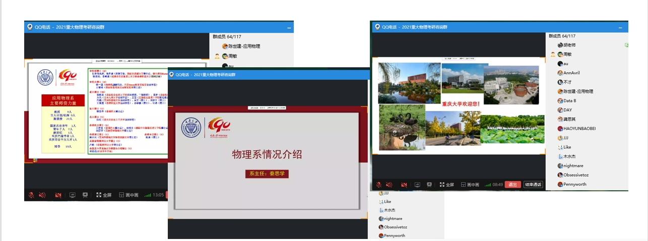 物理学科做了整体介绍;之后,陈世建教授和秦思学教授分别对应用物理系和物理系各研究团队做了全面细致地介绍。最后的答疑环节中,学生就推免生复试、奖学金、宿舍环境等问题踊跃提问,老师们一一解答并鼓励各位同学积极备考。