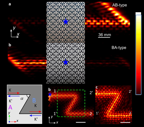 该论文通过在衬底上沉积金属图样做成宏观尺度的样品来构造人工表面等离激元晶体(designer surface plasmon crystals)。通过打破镜面对称(mirror-symmetry-breaking)在该晶体中实现了谷-霍尔拓扑绝缘体在经典光子学中的对应,并利用人工表面等离激元的表面束缚特性,实现了在试验中直接观测光子的谷-霍尔边界态。由于拓扑保护,这些边界态具有一些特定的性质,如单向激发和传输,在传输过程中基本不受尖角的散射等。可以基本没有散射损耗的绕过尖角,大大提高了传输效率。通过调节激发源的相位能实现选择性单向激发和传输,为单向传输和通讯提供了理论基础和实验可能。