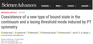 为第一单位和通讯单位在Science子刊《Science Advances》上发表理论论文。该论文在PT对称和连续谱中束缚态这两个领域取得重要研究进展。