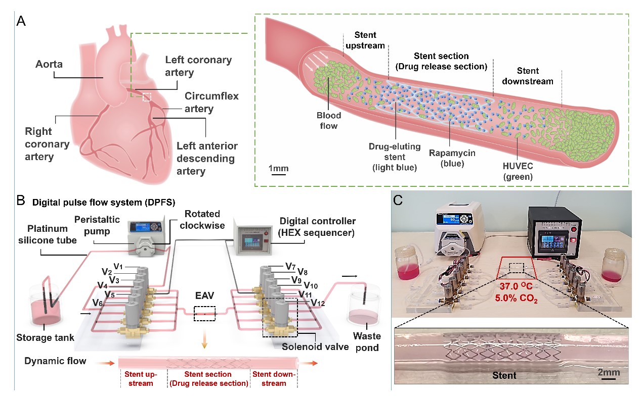 刘雳宇教授与首都医科大学附属北京安贞医院彭红玉、重庆海吉亚肿瘤医院张鸿飞课题组等合作,在体外构建了基于数字脉冲系统和弹性类血管模型的一体化实验平台,可用于评估支架类型对心血管狭窄病变术后的二次狭窄与血管痉挛风险。该研究工作发表于微流控领域顶级期刊《Lab on a chip》,中文无码