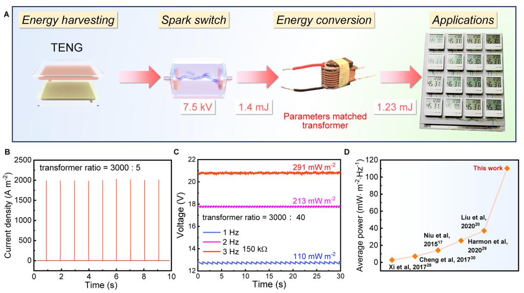 图1 高电压TENG的能源管理的设计与性能。A,能量管理策略,首先提高低频TENG的电压(7.5 kV),以击穿Spark开关,该能量再经参数匹配的变压器高效转换,可以驱动4´4并联的温湿度计。B,能量管理后的电流密度,C,负载电阻上的电压及平均功率,D,平均功率与其他能量管理工作的对比。