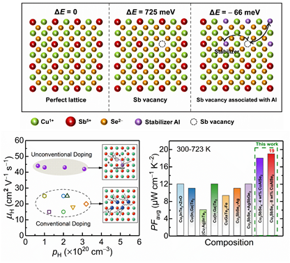 新能源材料与器件课题组报道了一种高效率提高半导体的载流子浓度并且保持高迁移率的非常规掺杂效应。在这项工作中,作者通过实验表征和理论计算, 将CuAlSe2复合于Cu3SbSe4基体上,引入微量的外来原子Al来稳定Cu3SbSe4中的Sb阳离子空位。结果表明,在“稳定原子”Al的帮助下,Sb位置原子的空位形成能降低,在高效率提升载流子浓度的同时,对载流子的迁移率影响甚微,从而达到优化热电材料电学输运性能的目的。比起常规掺杂手段,非常规掺杂方式显示出更高效率的电性能协同优化(载流子浓度与迁移率)。同时,这项工作在热电性能的优化上取得了突出成绩,例如,在673 K时获得峰值功率因子为20 μW cm–1 K–2,且在300~723 K的温度范围内平均功率因子为19 μW cm–1 K–2,平均热电优值提升到0.72,均为目前铜基类金刚石结构的热电材料报道的最高数值。