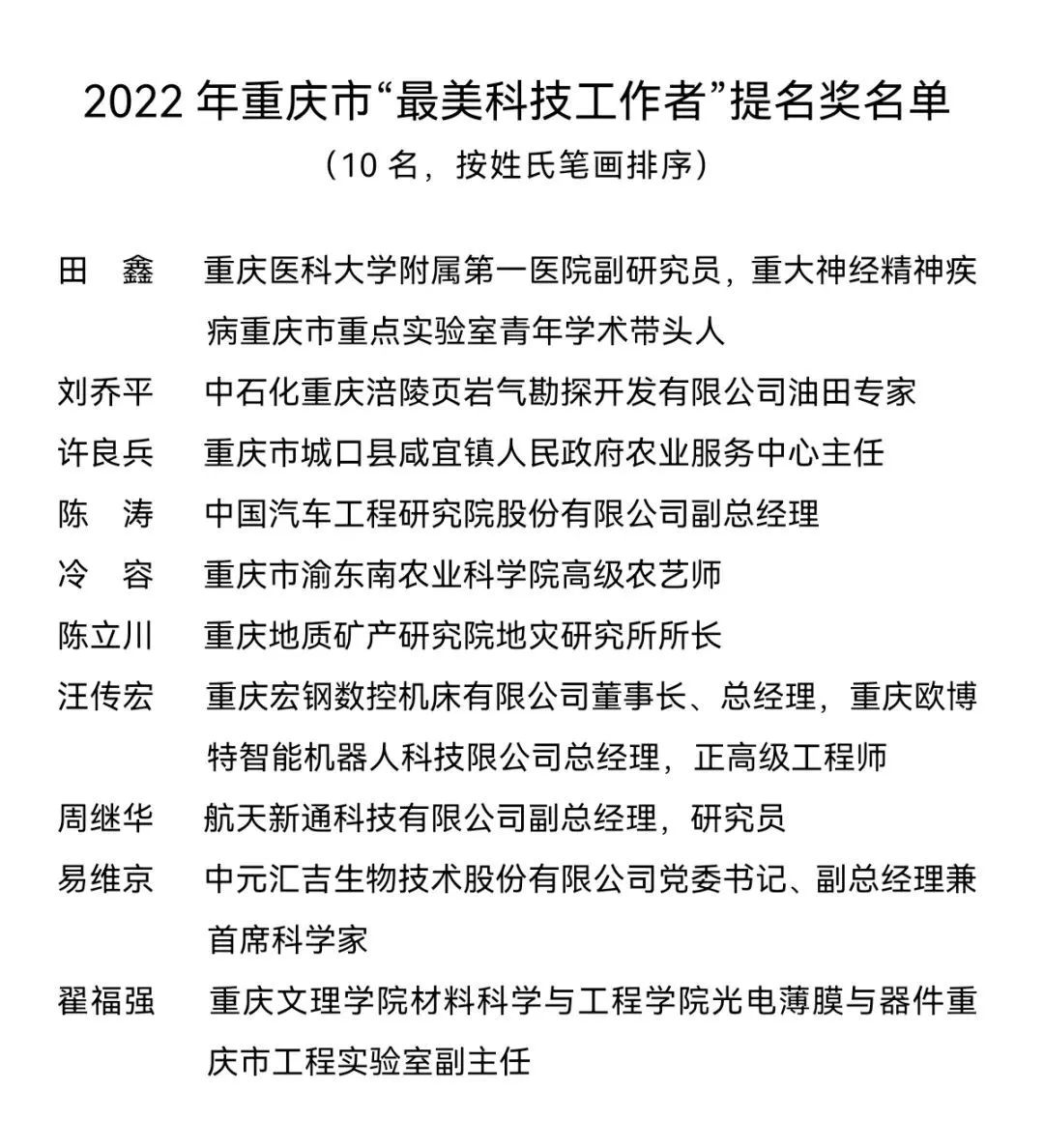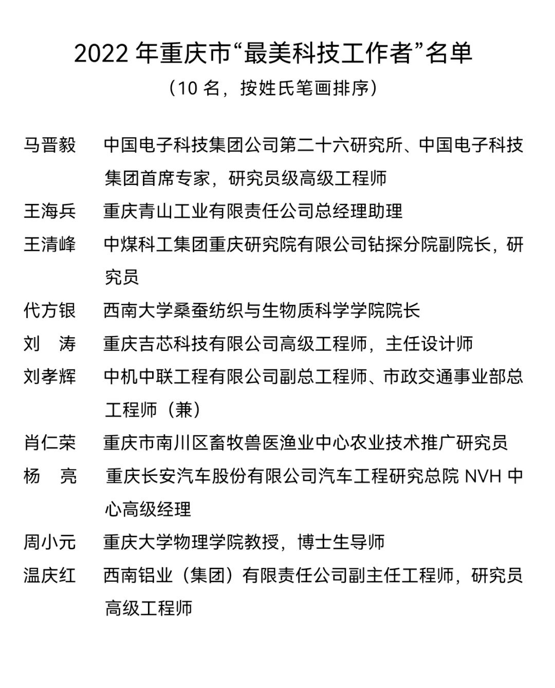 周小元教授获评2022年重庆市“最美科技工作者”(共10人)。