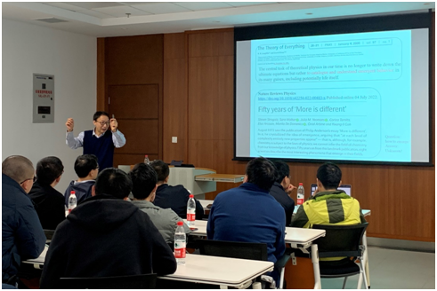 师生作了题为《量子多体系统的困境与解决途径初探》的学术报告。在报告中,罗洪刚教授首先分析粒子图像导致的多体问题的困境并简要提及相变研究的线索,然后提出粒子的有组织模式(图案,pattern)可能提供一个解决途径。然后,以一维横场伊辛模型为例,演示如何生成图案并应用于理解该模型的相变。罗洪刚教授在报告中指出,复杂的衍生现象背后的基本规则都是非常简单的,寻找并揭示这些简单的规则如何衍生出复杂的物理现象是理论物理发展的基本目标之一。最后,罗洪刚教授与参会师生进行了热烈地交流讨论,并详细解答了现场老师和同学提出的问题。