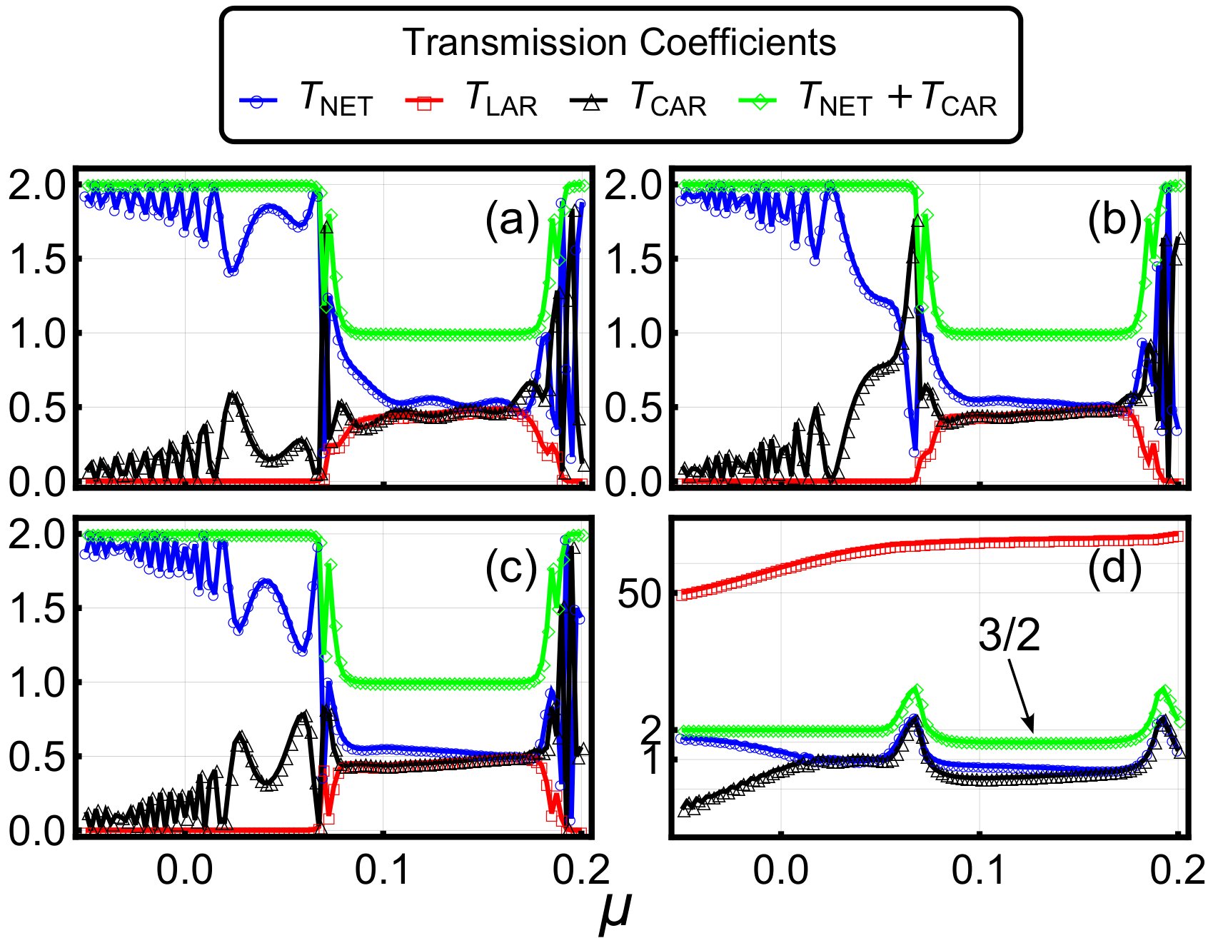图 2 两端口输运系数随化学势变化的行为。缩写含义:NET=正常电子透射,LAR/CAR=局域/交叉安德烈夫反射。