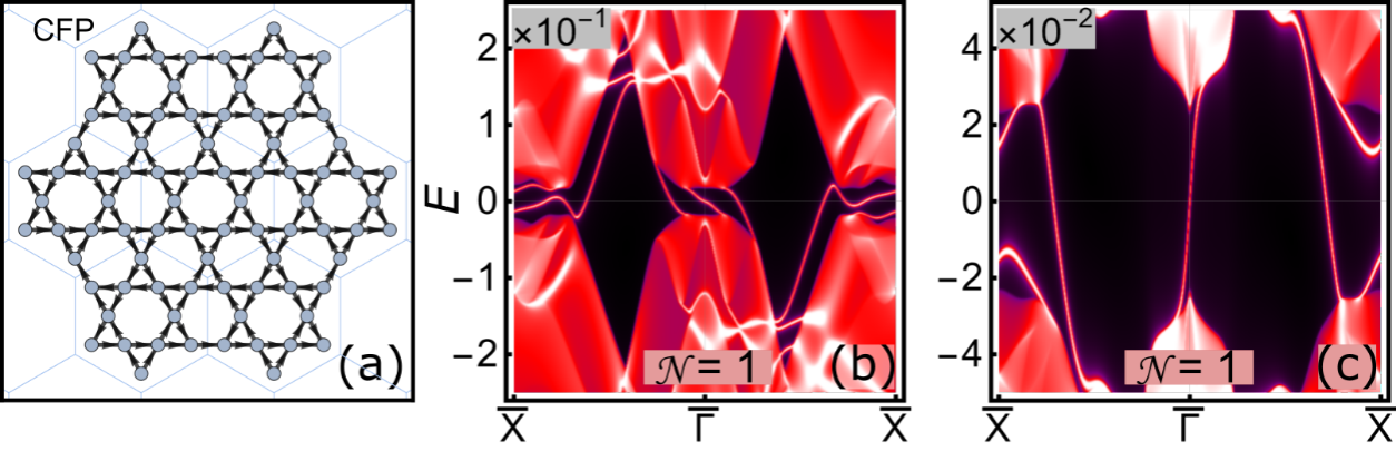 针对以上情况,该课题组系统研究了笼目晶格体系中三种可能的电荷密度波序与自旋单态s波和d波超导配对协作下产生的量子态。理论计算表明,破坏时间反演对称性的2×2电荷密度波手性通量相 [如图1(a) 所示] 可导致具有非平庸陈数的手性拓扑超导态,揭示了一种无需磁场驱动的手性拓扑超导产生机制。通过谱函数信息研究人员发现,该拓扑超导态具有奇数支无能隙的马约拉纳边界模的,然而,马约拉纳边界模并非单一手性,而是呈现出手性混合的状态,如图1(b)-(c) 所示。