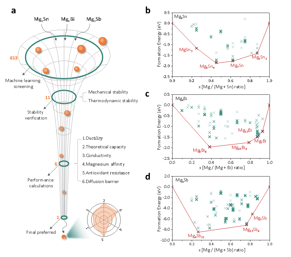 为解决这一难题,研究团队开发了一套结合分步稳定性筛查与电子性质评估的组合式高通量策略。研究聚焦于极具潜力的Mg-Sn、Mg-Bi、Mg-Sb三大合金体系,通过机器学习辅助结构搜索,系统研究了613种不同成分的合金,并逐级完成了相稳定性、机械稳定性与热力学稳定性的严格筛选。在此基础上,团队进一步系统评估了包括延展性、理论容量、导电性、镁亲和性、抗钝化能力及镁离子扩散势垒在内的六大关键指标,从中筛选出综合性能突出的镁离子电池合金负极候选材料Mg₇Sb,为镁电池负极材料的设计提供了新的优选方案。