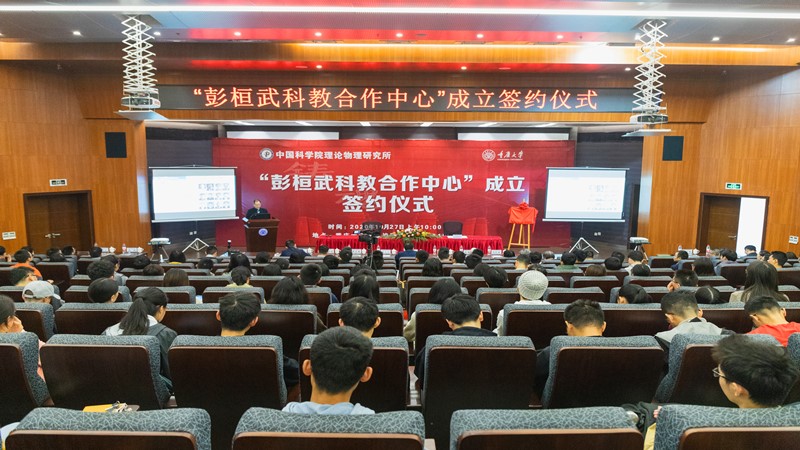 Witnessed by the ceremony participants, on behalf of Chongqing University and Institute of Theoretical Physics, Chinese Academy of Sciences, Xia Zhining and Feng Ji signed the agreement and Cai Ronggen unveiled the nameplate of "Peng Huanwu Science and Education Cooperation Center". Relying on the "Peng Huanwu Science and Education Cooperation Center", both sides will fully utilize their respective resource advantages, strengthen cooperation and exchanges, achieve the effective integration of science and education, and establish a comprehensive, wide-ranging and multi-level cooperative relationship.