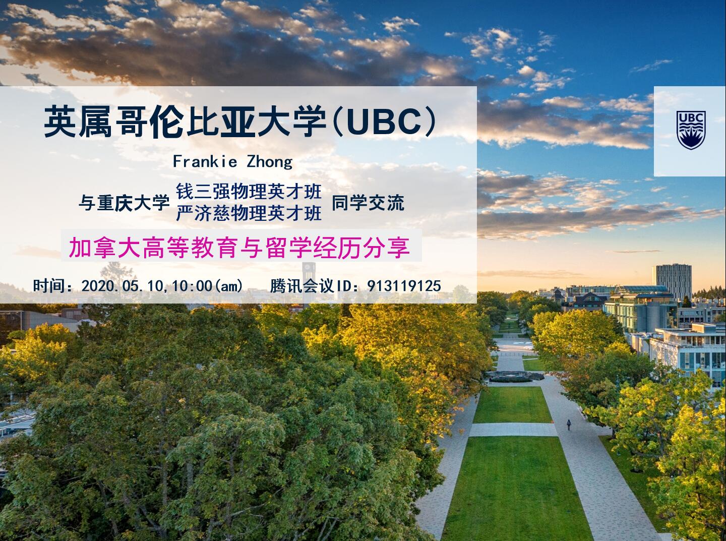 7. 2020年05月10日,邀请加拿大英属哥伦比亚大学(UBC)Frankie Zhong女士分享加拿大高等教育与留学经历分享;
