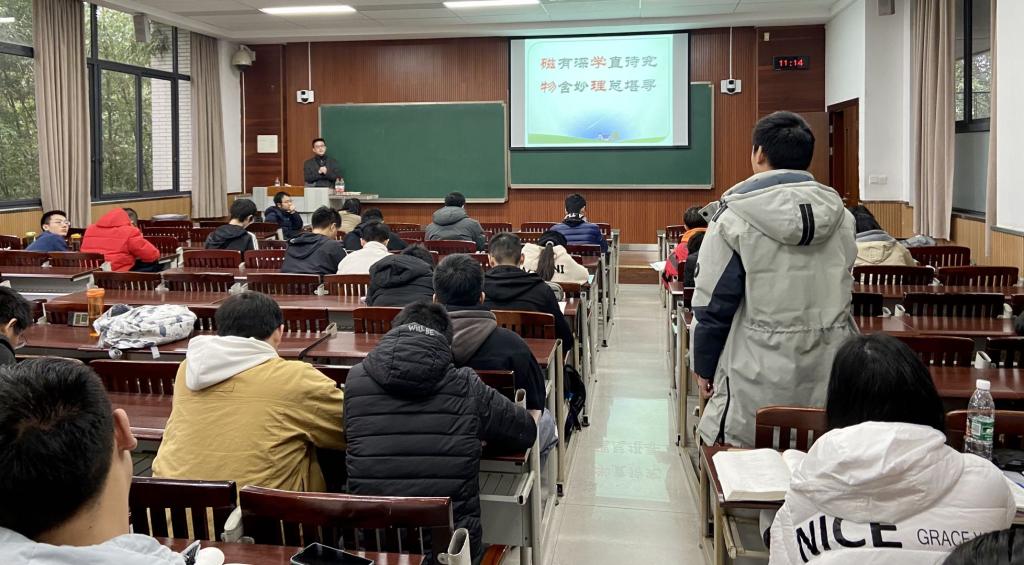 孙阳教授以“磁学概论”为主题,从日常生活中的磁性现象出发,对磁学的发展历程、应用场景、研究现状、及未来趋势等前沿研究动态进行了充分讲解。报告期间,同学们兴趣浓厚,提出了诸多有趣的问题,与孙阳教授就自旋电子学等前沿领域的发展前景及瓶颈等话题进行了充分讨论与交流。